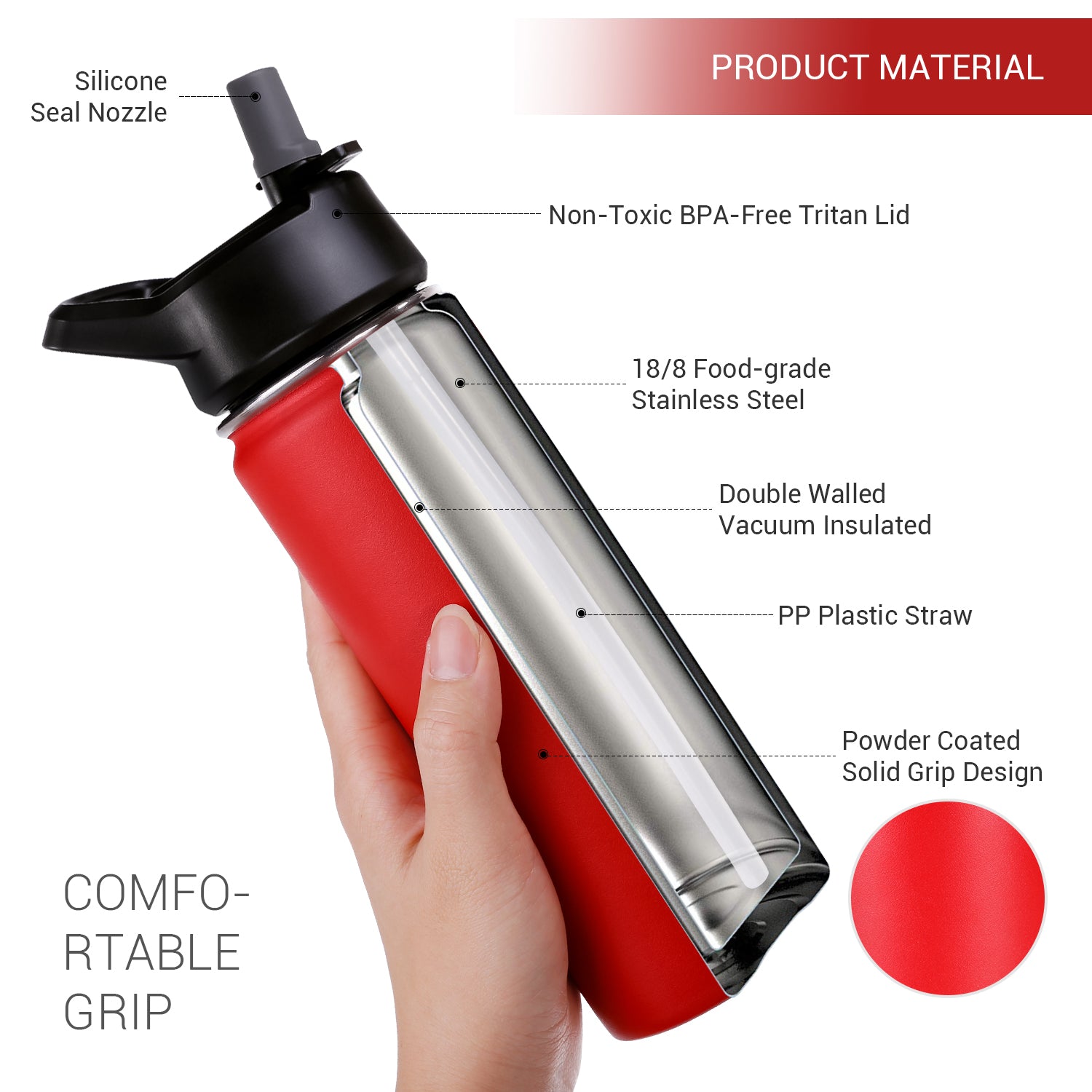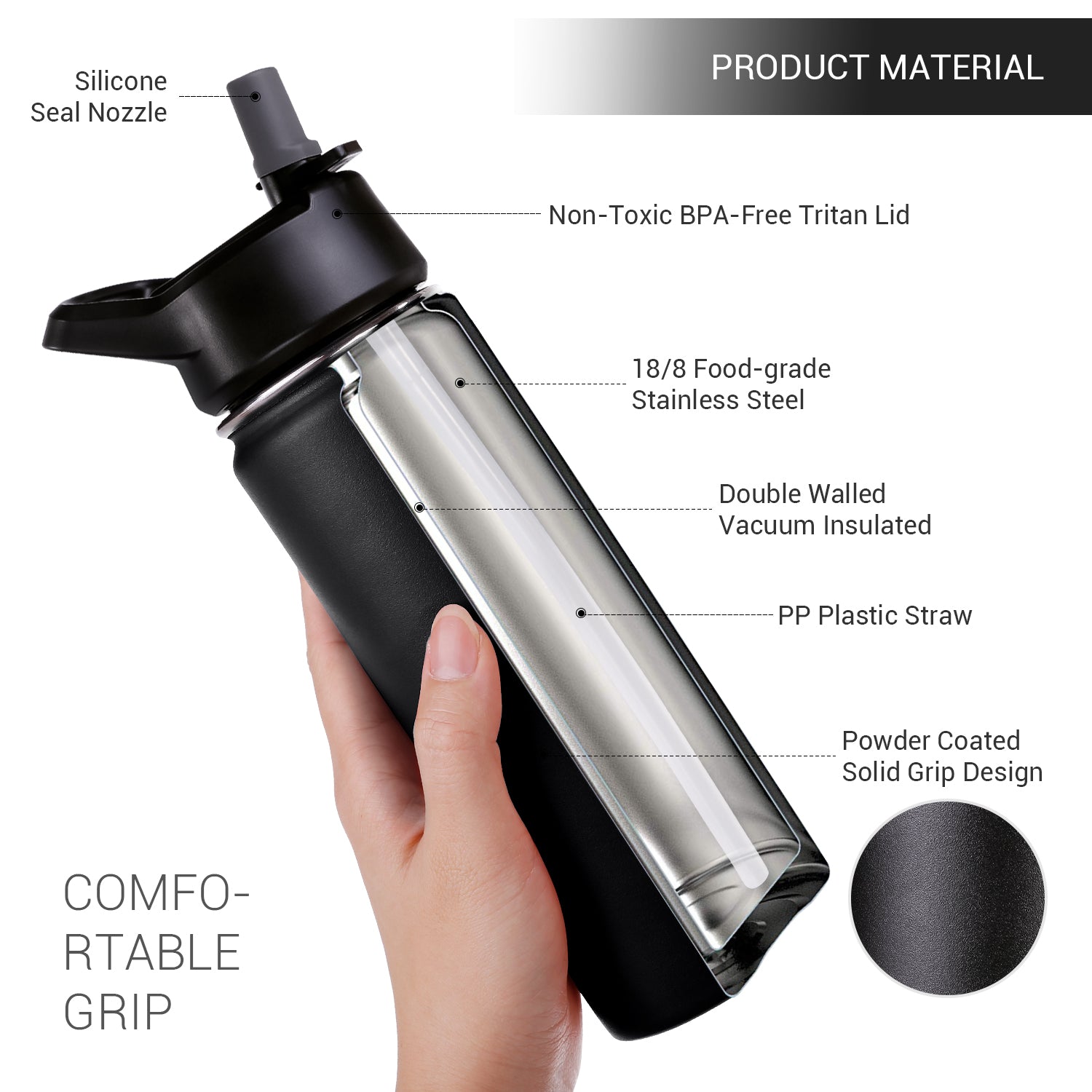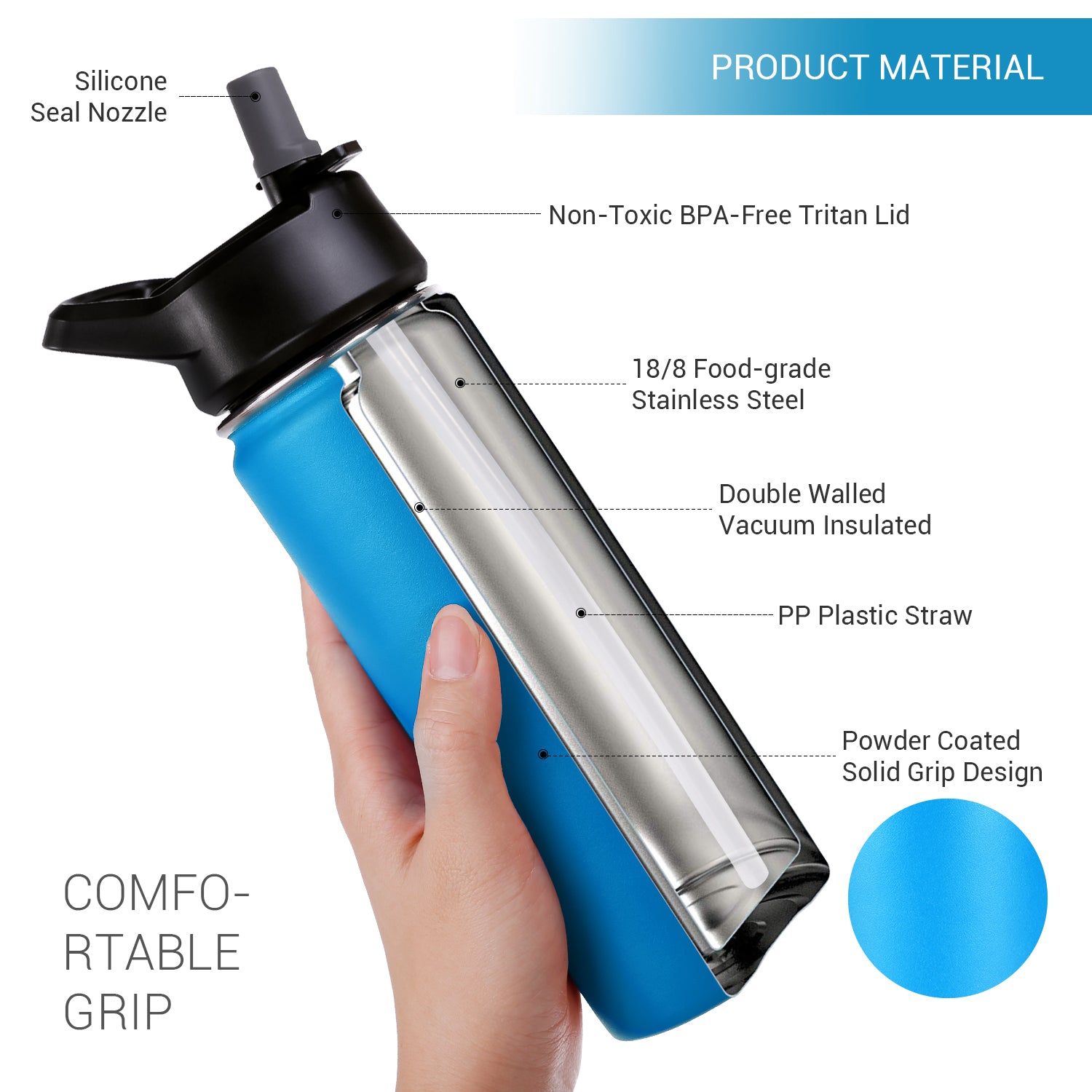 - Non-Sweat Design: Our Sealed sports bottle with leak-proof Straw Lid, It features a sturdy carry handle for convenient portability. The Vacuum water bottle doesn't transfer coffee, beer, wine or juice flavors.