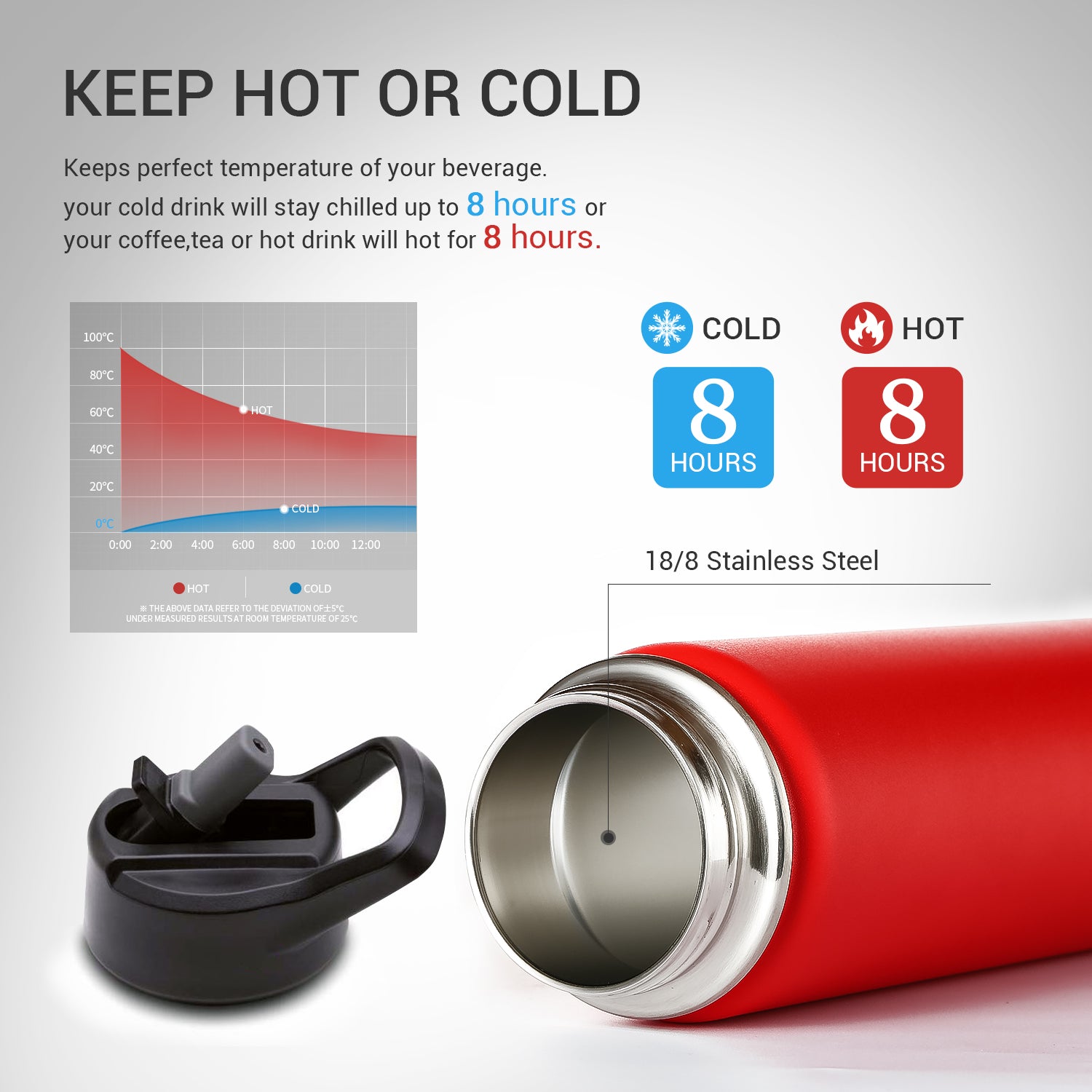 - Insulated Thermos Cup : This Stainless Steel Water Bottle with double-walled vacuum insulation. Non-toxic BPA-free functional. It can keep beverages cold for 8 hours, and hot for 8 hours.