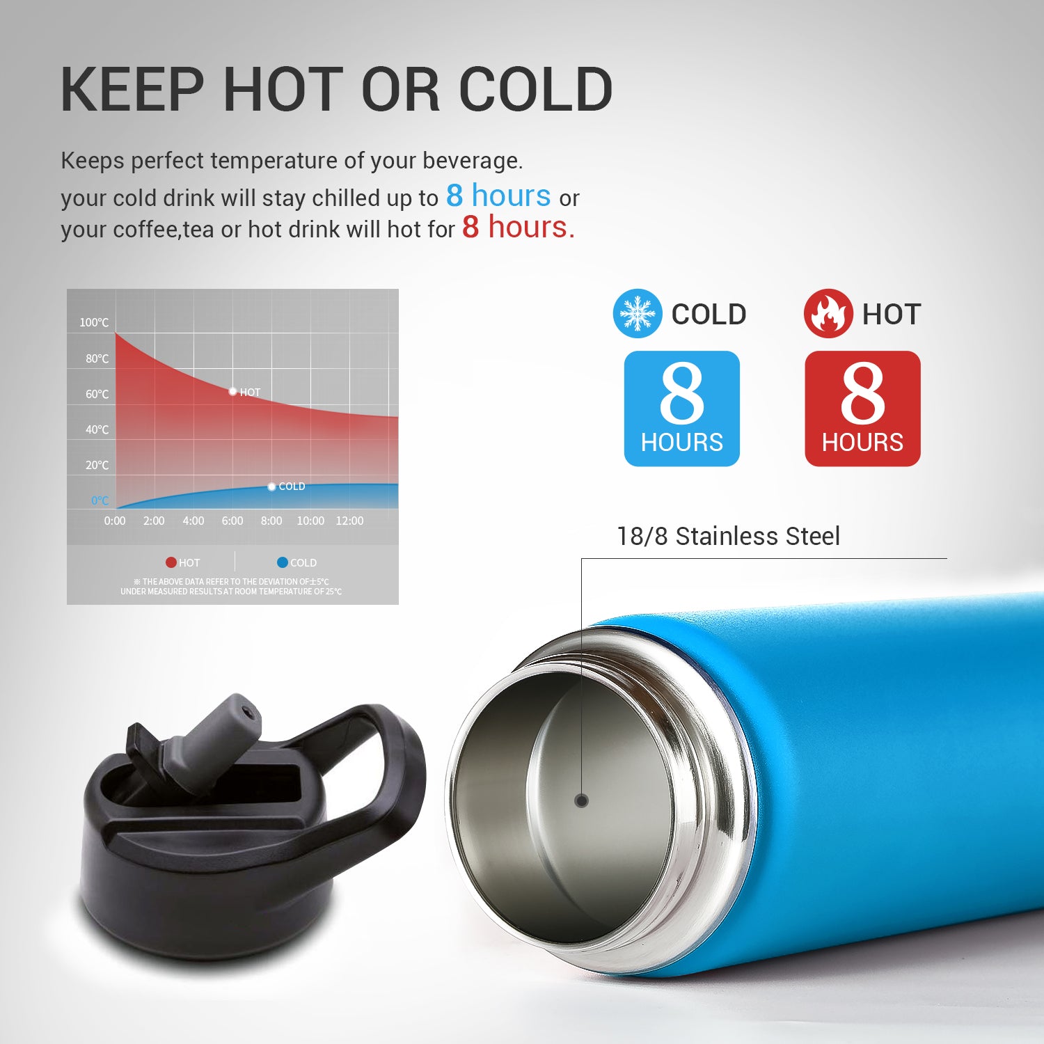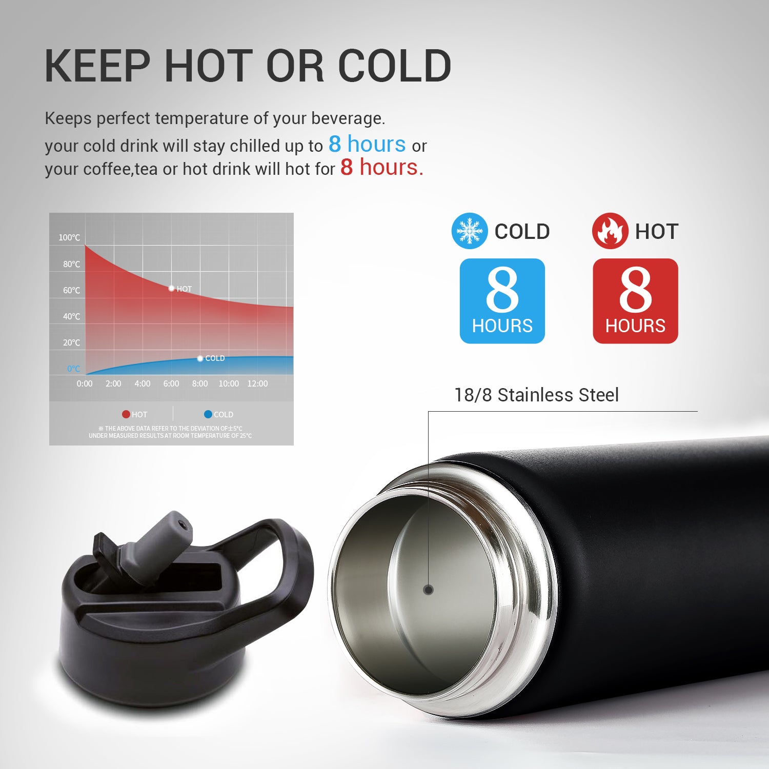 This?Insulated water bottle?with double-walled vacuum insulation tech. keeps drinks hot for 8 hours and cold for 8 hours.