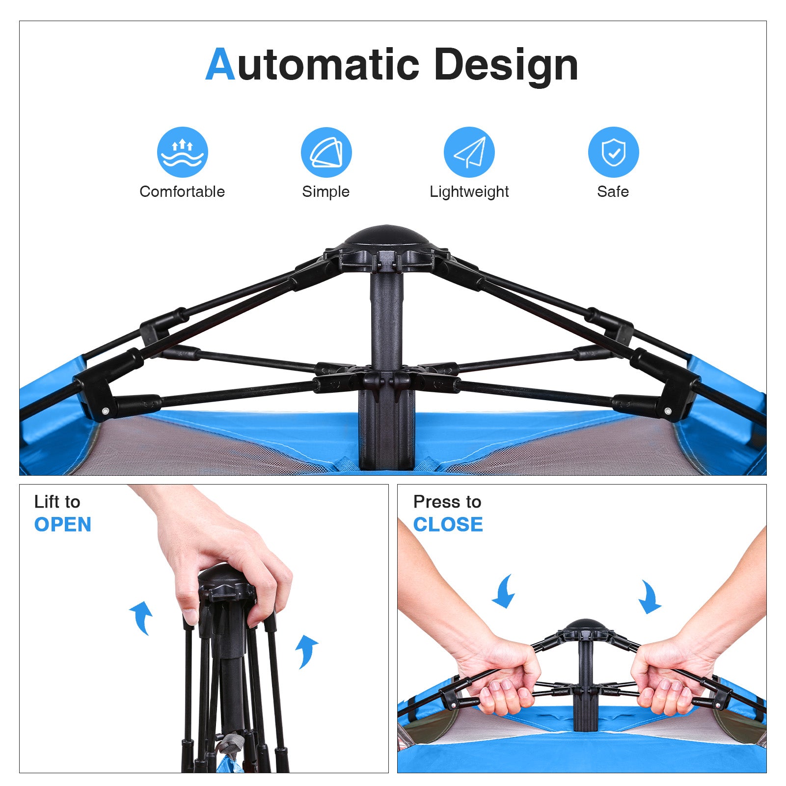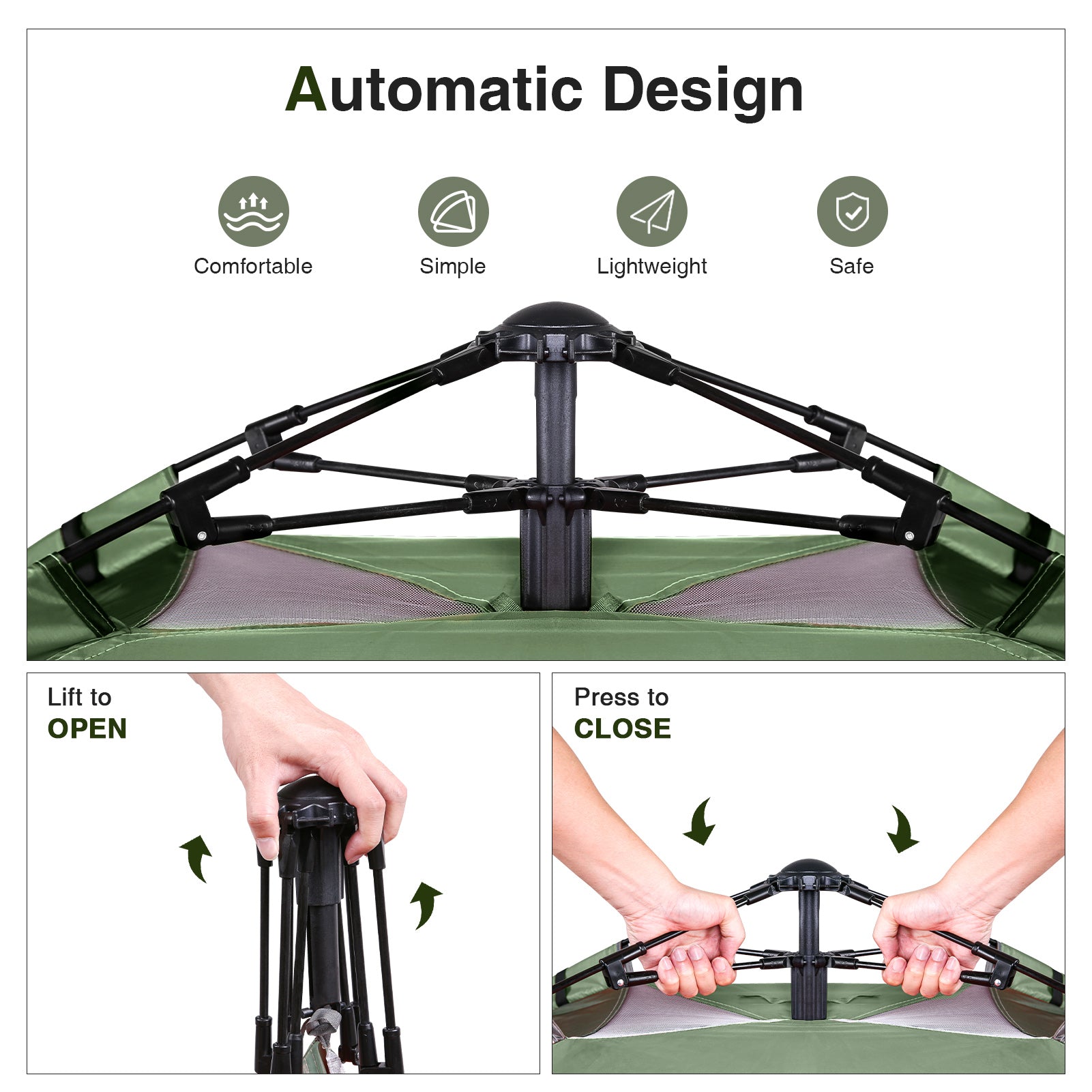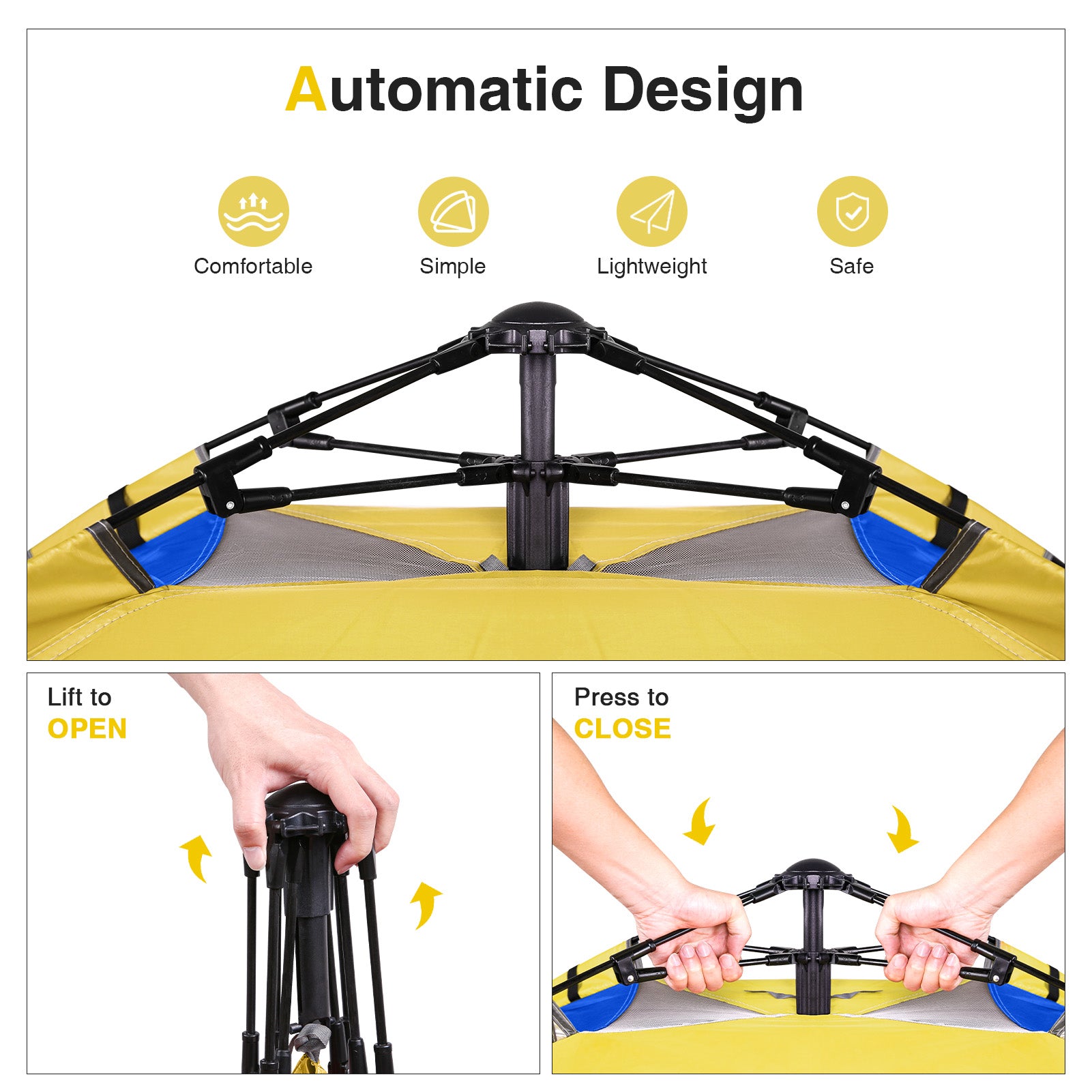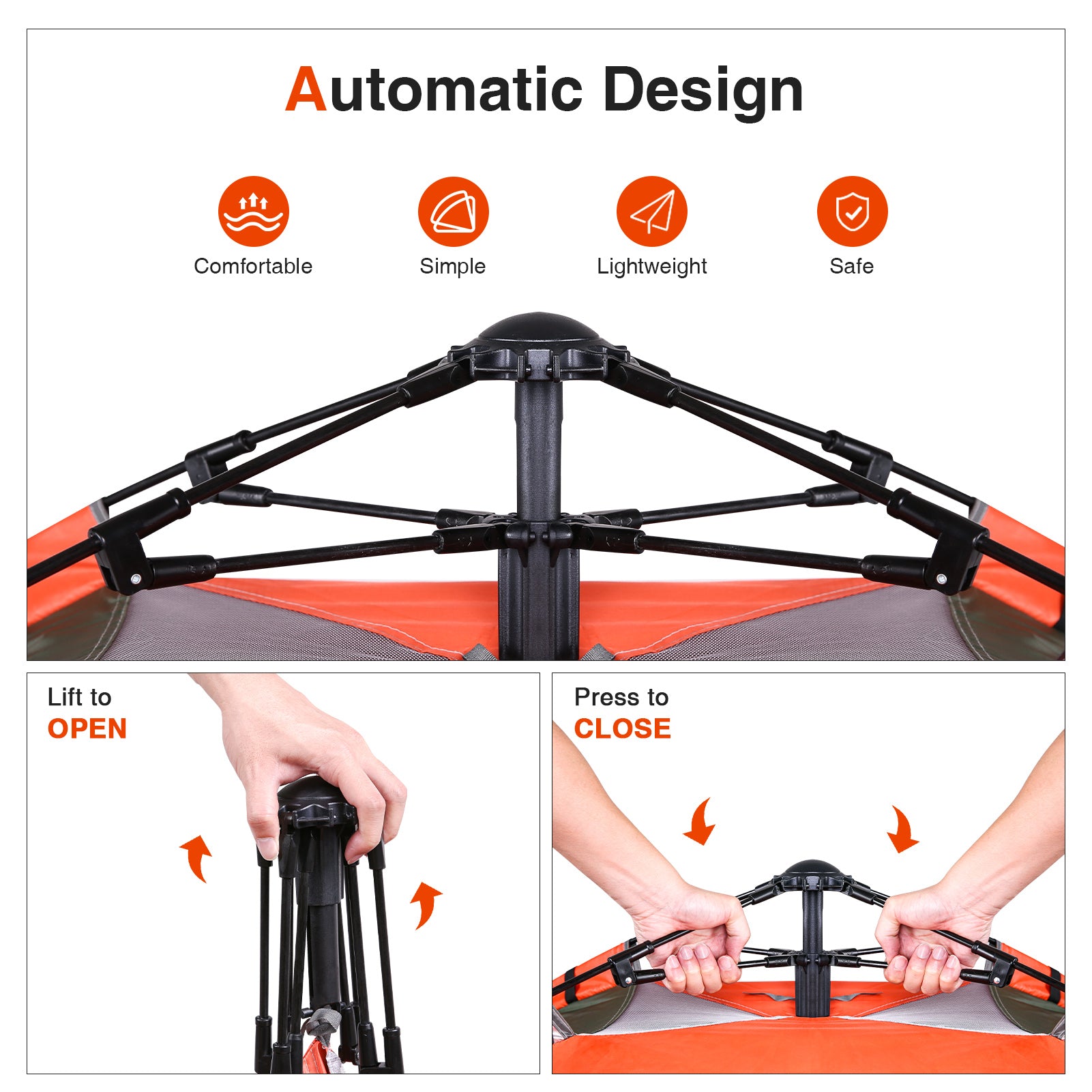 - JUST POP IT UP - This Hydraulic tent are easy to set up. Unfold the instant tent on the ground, grab the upper bar and lift it up. Any single person can set up a tent on their own.
