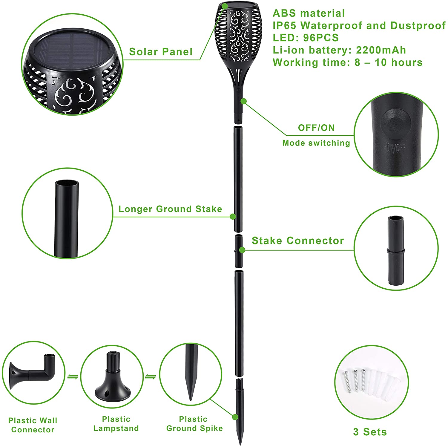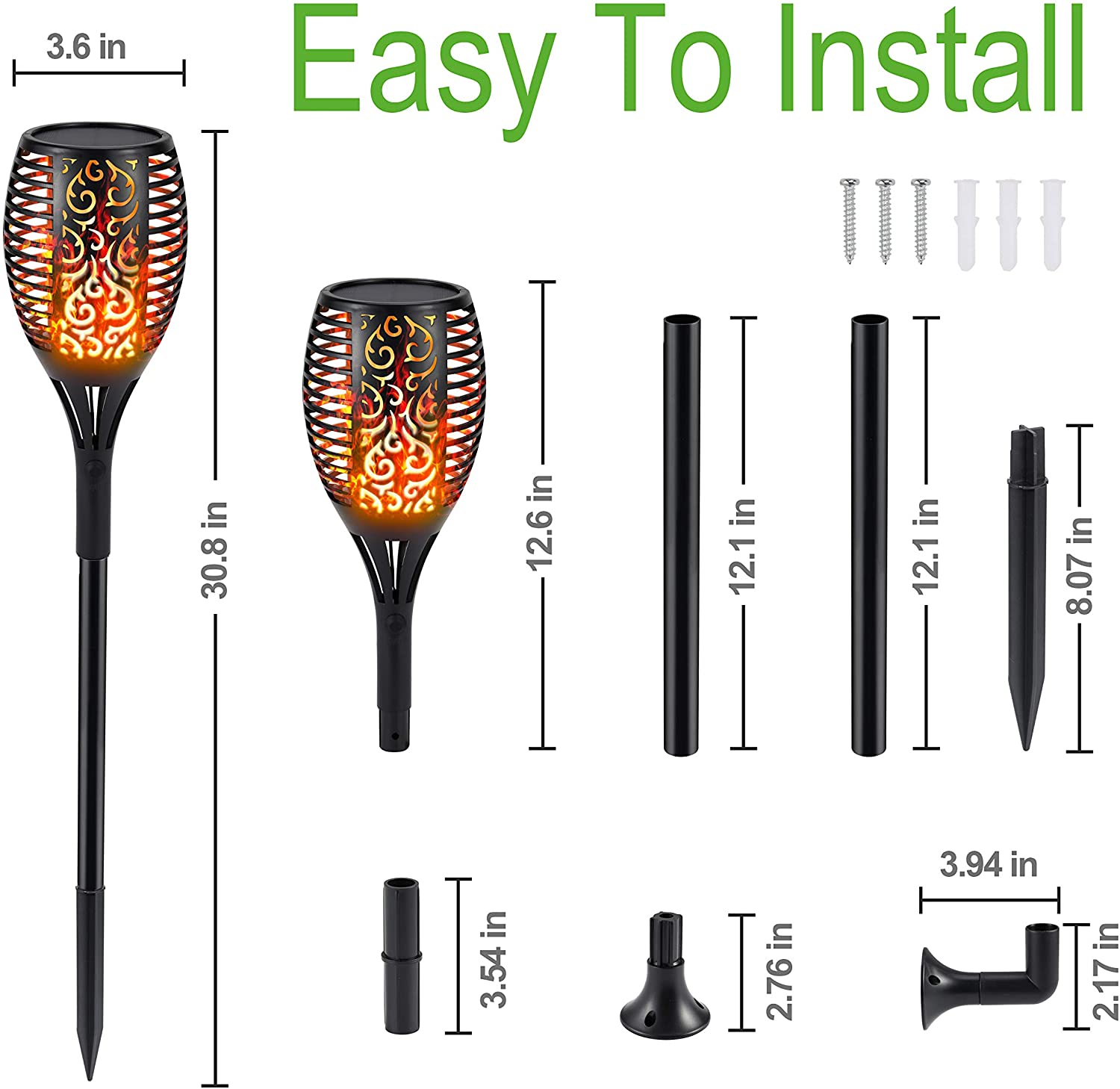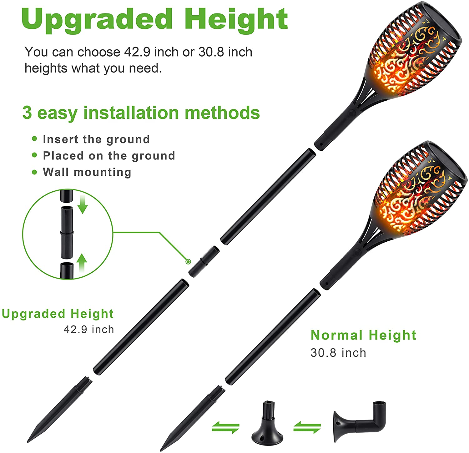 - ?3 Easy Installation: Simply connect the solar lights and pipe, and then easy install the torch light insert the ground, placed on the ground or wall mounted. Extra stakes can reach height 30.8 inches or 42.9 inches which you need.
