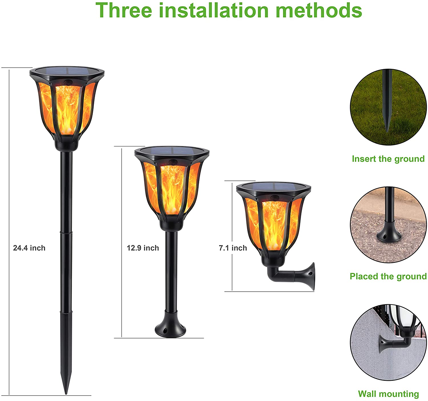 - 3 Easy Installation: Simply connect the solar lights and pipe, and then easy install the torch light insert the ground, placed on the ground or wall mounted. Extra stakes can reach height 30.8 inches or 42.9 inches which you need.