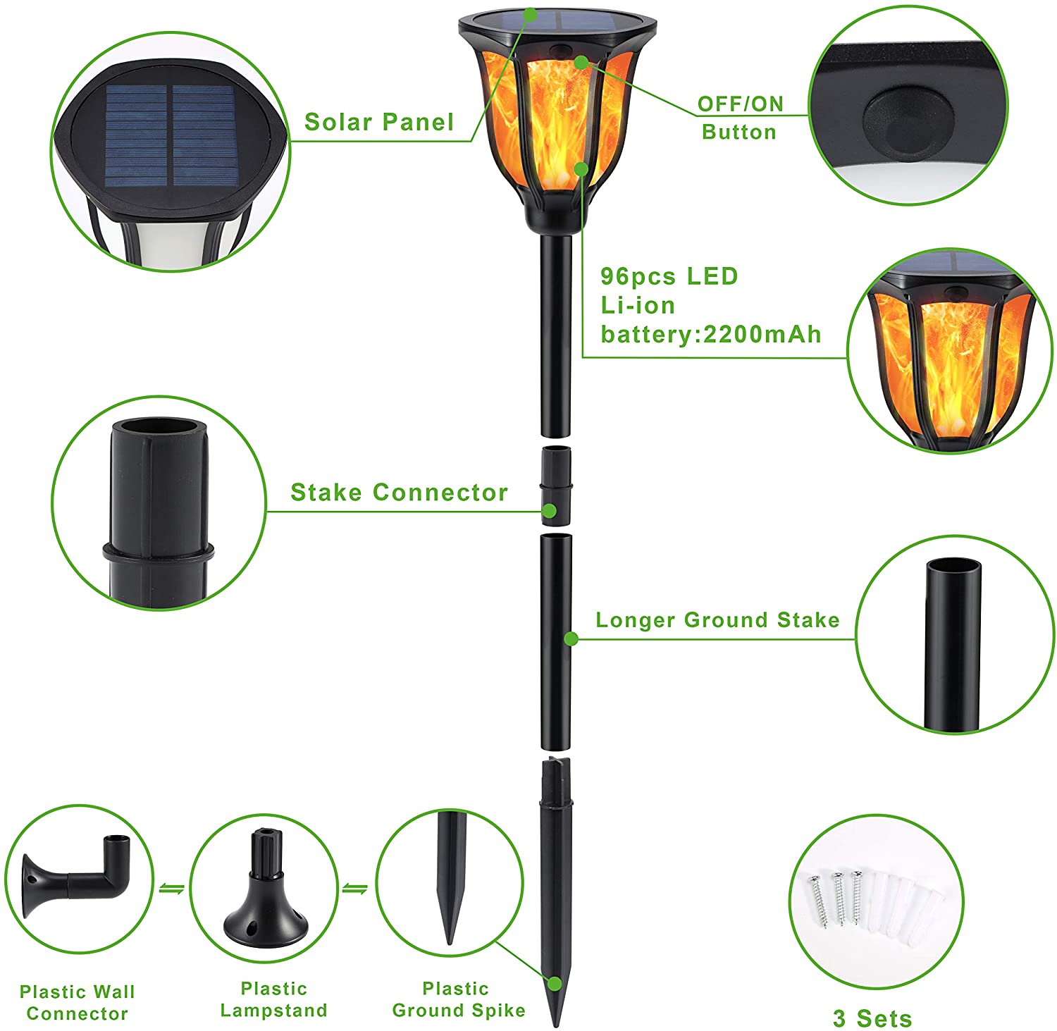 - Gorgeous Dancing Flame Design: S.Y. solar torch light is a safe alternative to the real ¡°flames¡± with 96 LEDs inside, which cast a safe, soft and mood-enhancing glow to decorate surrounding for the garden, party, holiday etc.