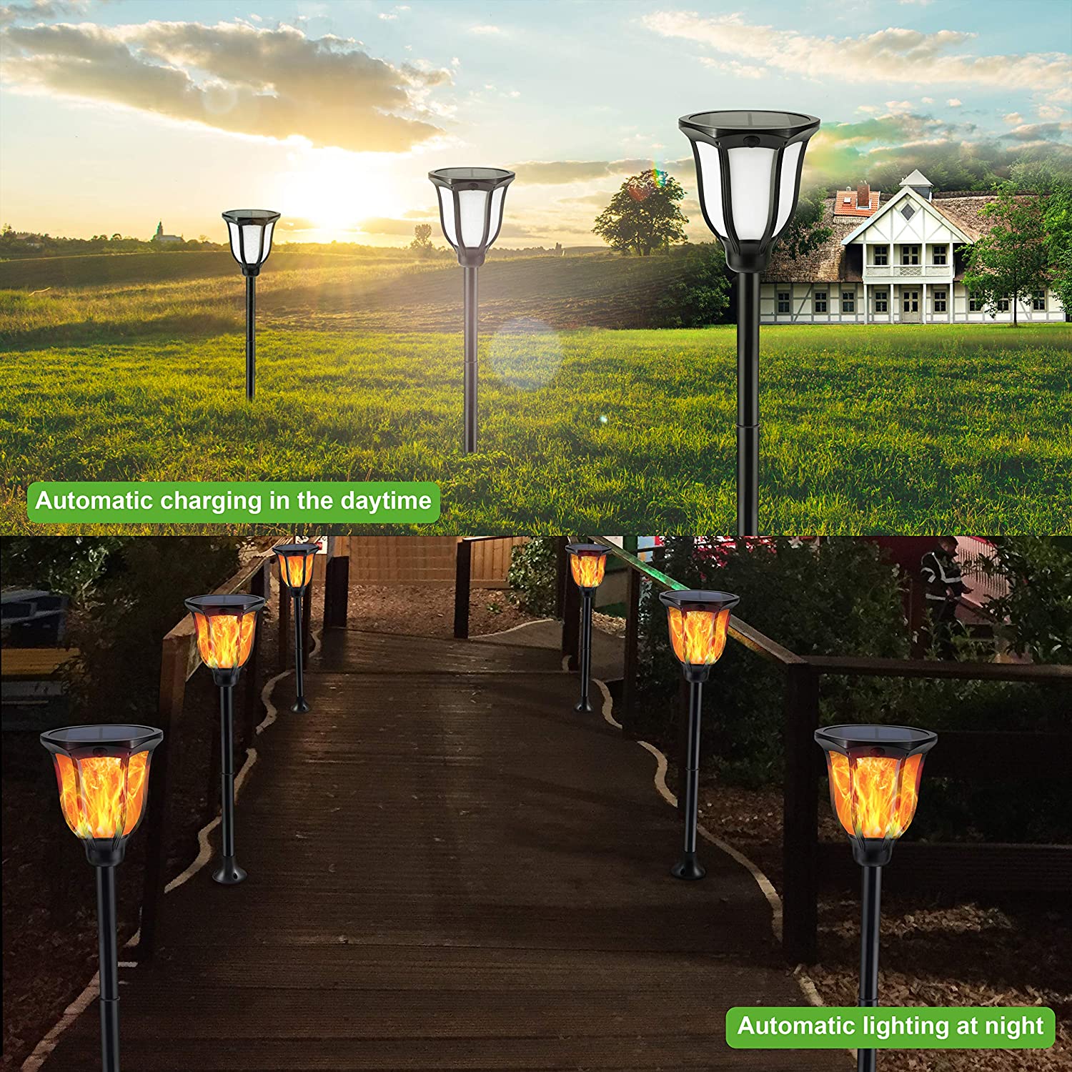 - Solar Powered & Auto On/Off: Flickering flame torch lights built-in 2200mAh high capacity battery and high-efficiency solar panel. The solar torch light collects solar energy all day under direct sunlight, then light up automatically at dusk/night and turn it off when it's dawn.