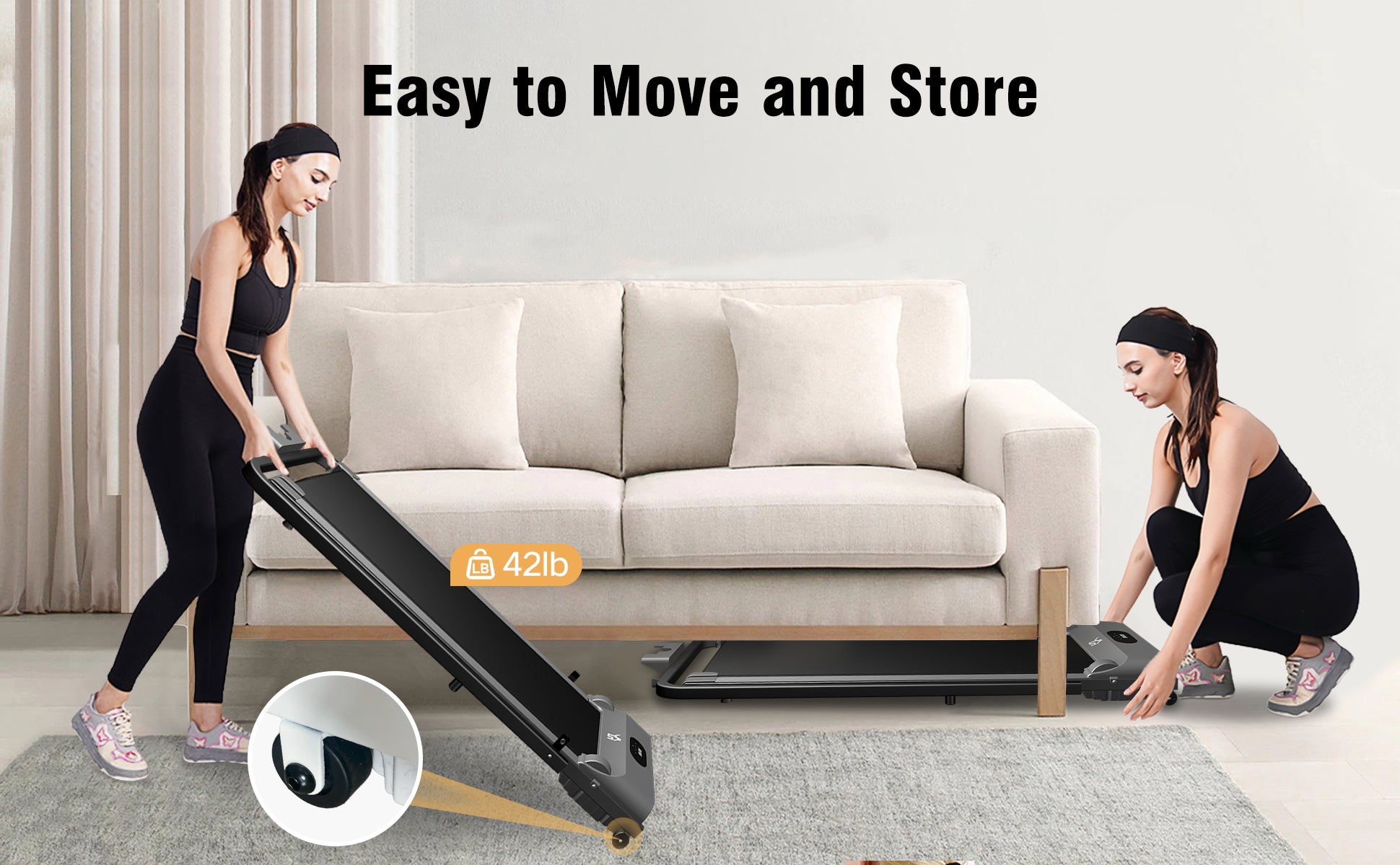 EASY TO MOVE & SPACE SAVER DESIGN】The uneder desk treadmill arrives was assembled already,and can be used directly after unboxing. There is transport wheels so that it is easy to be moved and placed under sofa,corner or bed to save your home space.